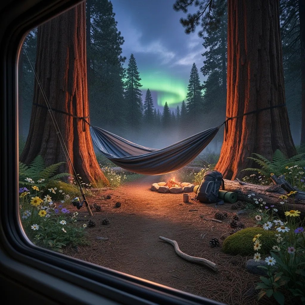 A quiet campsite rests under towering sequoia trees as the sky glows deep blue with hints of green light. A gray and blue hammock swings gently between the trunks, with a fishing rod leaning nearby. Wildflowers and soft pine needles cover the forest floor around a small fire ring and scattered camping gear.