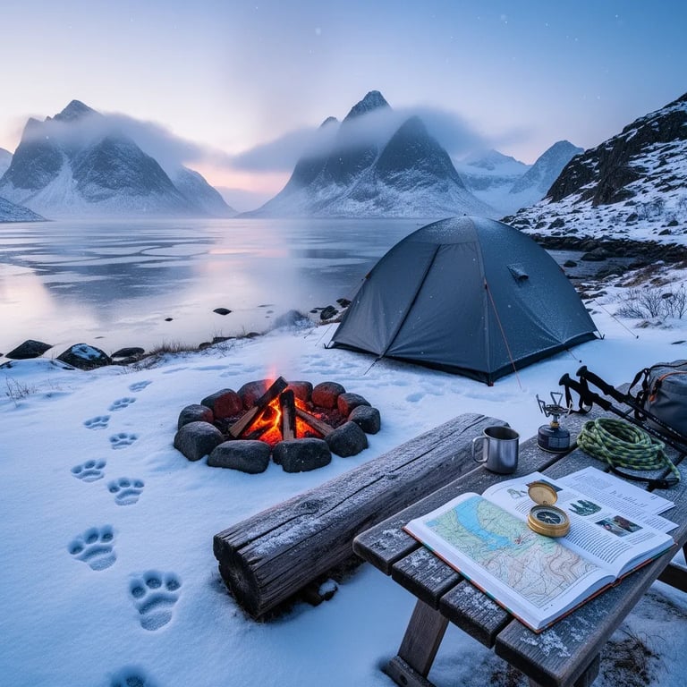 A small grey tent sits by a calm, icy lake, with tall misty mountains rising in the distance. Soft snow falls on the rocky ground, where animal tracks lead toward the water. A quiet campfire spot, a wooden log bench, and a table with a map and compass make it feel like a secret explorer’s base. The cold blue morning light and warm fire glow make the campsite feel peaceful and cozy.