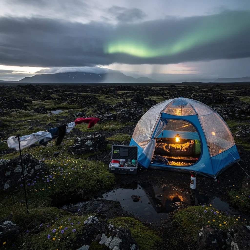 A stormy dusk hangs over a wide, rocky plain covered in soft green moss and tiny wildflowers. A clear blue bubble tent glows warmly in the cold air, while wet puddles mirror the dark clouds and a faint ribbon of northern lights. Nearby, a clothesline snaps in the wind beside scattered camping gear on the lava rocks.