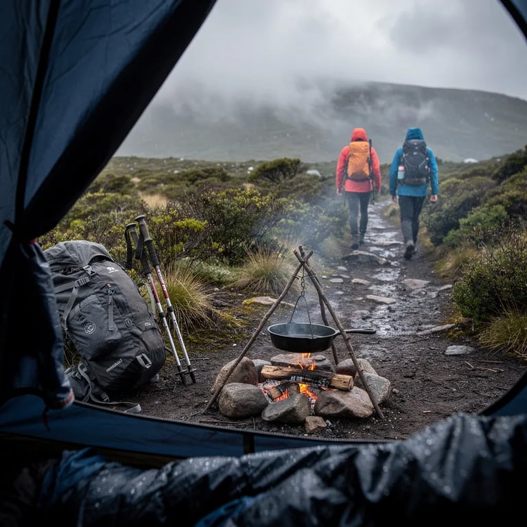 A cool mist hangs over the alpine trail, and the ground outside the tent is dark and wet. A backpack and trekking poles rest by the path while two hikers in rain coats pass by. A small campfire sends a thin curl of smoke up under the gray sky, with a skillet hanging over the flames.