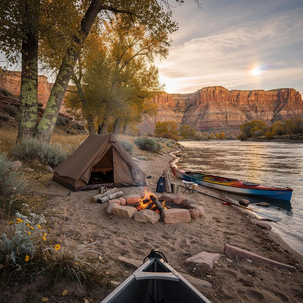 A small brown tent sits on a sandy riverbank as the calm water glows in the golden sunset. Red rock cliffs rise far away, and cottonwood trees and tiny wildflowers line the shore. A kayak rests half on the sand beside a paddle, and a campfire ring holds warm, glowing coals. The air looks chilly and crisp, but the whole place feels quiet and peaceful.