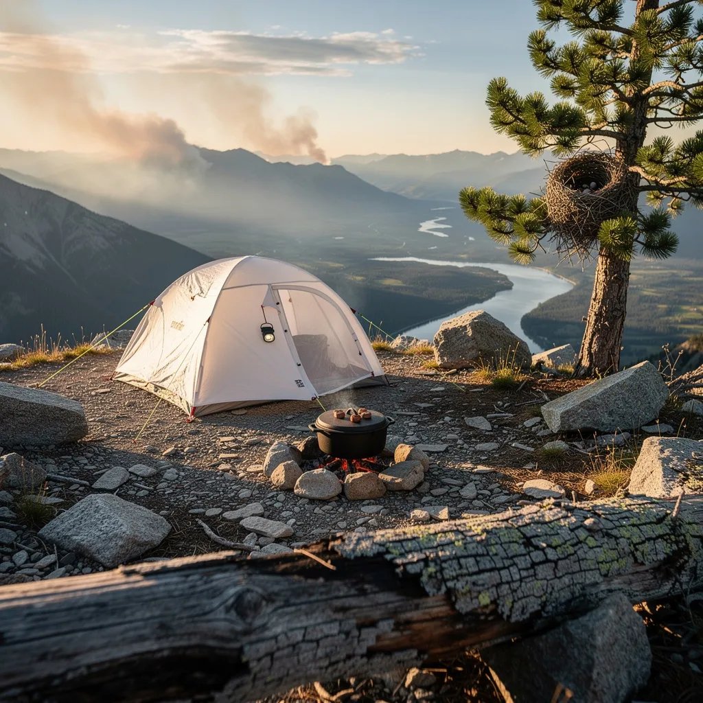 A white tent sits on rocky ground near a high mountain overlook, glowing in warm late-day light. A soft smoky haze drifts over a wide valley and far ridgelines. A small fire ring holds a Dutch oven with bright coals, and a headlamp hangs ready by the tent. Nearby, a pine tree cradles a little bird nest above a weathered fallen log.