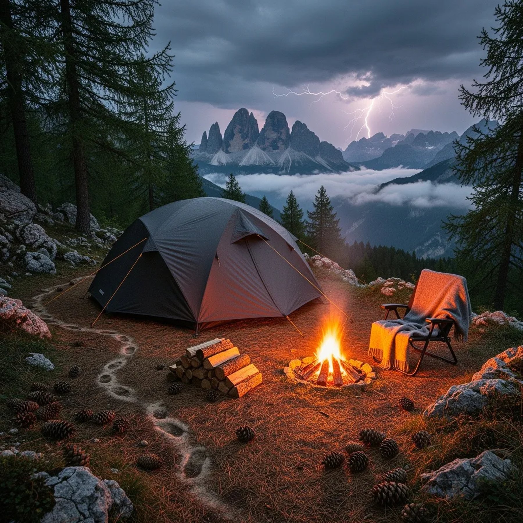 A lone tent rests on a rocky mountainside, tucked between tall pine trees under a stormy summer sky. A small campfire glows warmly, lighting up a cozy chair with a wool blanket. Distant jagged peaks rise like dark teeth, flashing white whenever lightning flickers in the clouds.
