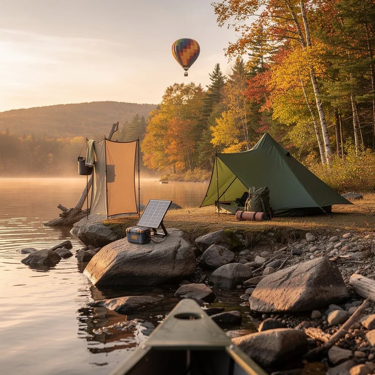 A quiet lake glows in the warm sunset as a canoe drifts toward a rocky shore. A green tarp shelter sits by the trees, with a small solar panel charging gear on a boulder. Nearby, a simple shower screen stands ready, and far away a hot-air balloon floats above the water.