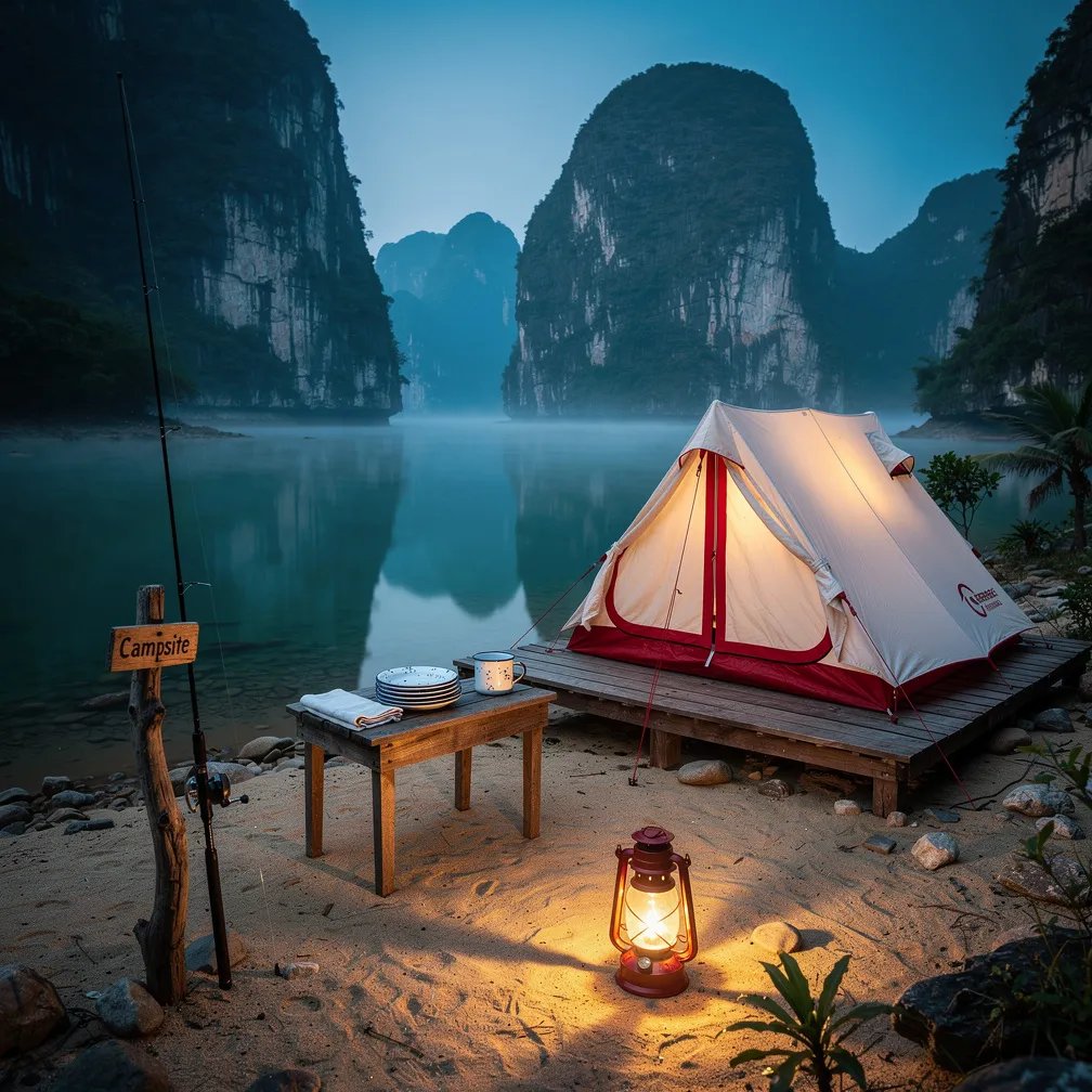 A quiet campsite sits by a still lagoon, with tall limestone cliffs rising in the mist. A red-and-white tent rests on a small wooden deck, and a warm lantern glows in the cool blue evening light. A fishing rod leans on driftwood, and a simple trail sign stands near a little table with stacked plates. The water is so calm it mirrors the whole scene like glass.