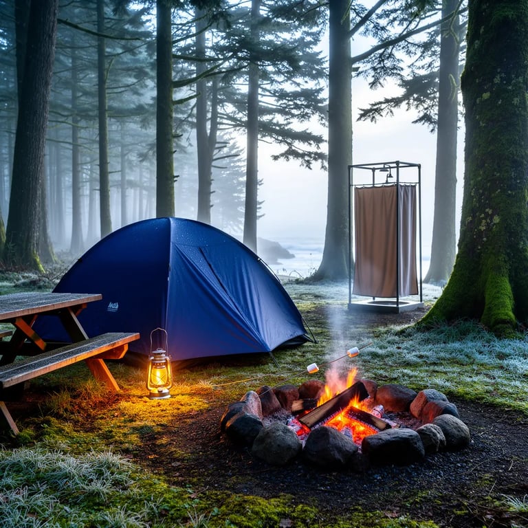 A navy blue tent sits on damp, mossy ground under tall cedar and fir trees, with mist drifting through the forest. Warm lantern light and a small campfire glow beside a weathered picnic table, making the chilly air feel cozy. In the distance, a faint ocean haze lingers, and a simple outdoor shower stands quietly near the trees.
