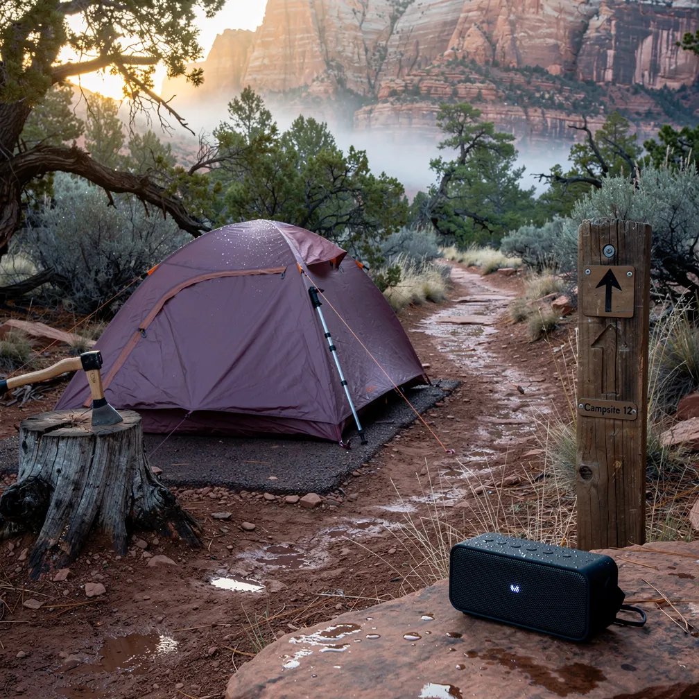 A purple tent sits beside a dusty trail in a red rock canyon, with wet ground shining from last night’s rain. Warm sunrise light glows through cool morning mist, and tiny raindrops sparkle on leaves and fabric. Nearby, an axe rests in a weathered stump and a wooden trail marker stands by the path. Desert pines and juniper frame the quiet camp as the canyon walls rise in the distance.