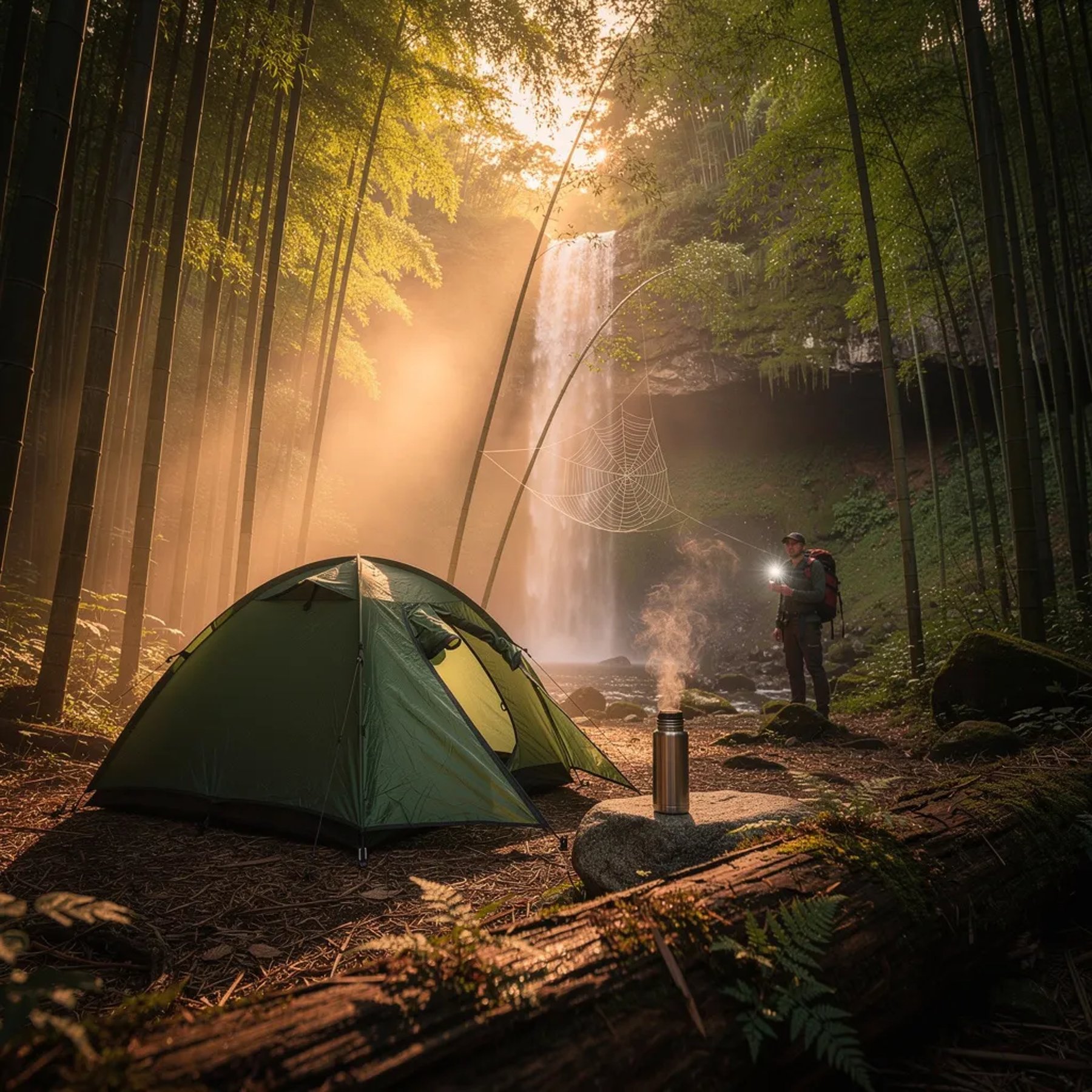A cozy green tent sits in a quiet bamboo forest as the sun sets in warm gold light. Mist from a nearby waterfall drifts through the trees, making bright sunbeams in the air. A shiny thermos rests on a rock, and a tiny spider web sparkles between two stalks. Farther back, a lone hiker walks softly with a small flashlight.