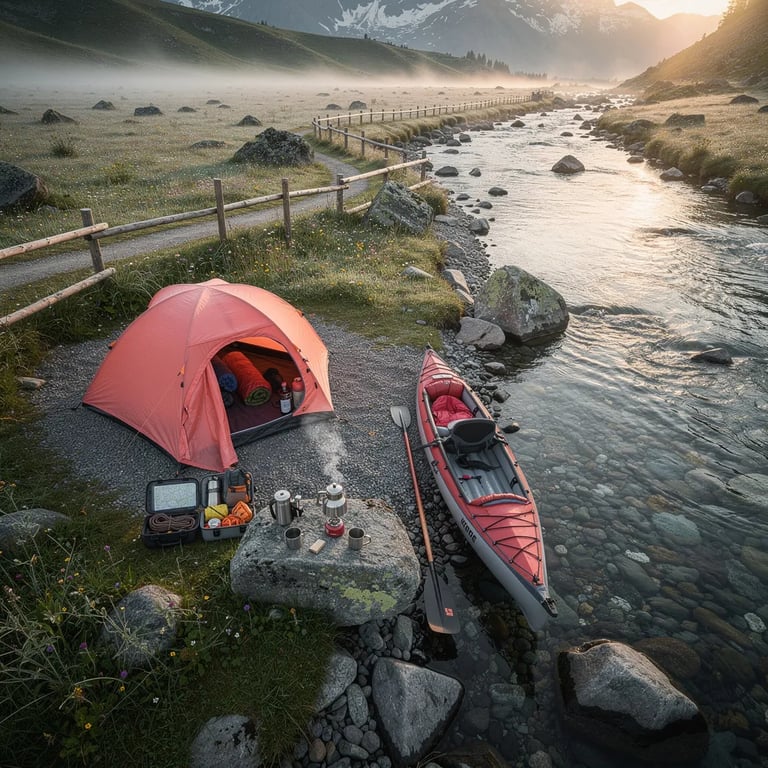 A bright coral tent sits in a wide alpine meadow beside a clear, cold stream. Wildflowers, smooth rocks, and a light morning mist make the valley feel calm and magical. An inflatable kayak rests on the pebbly shore, and a little stove puffs warm steam from fresh coffee in the soft sunrise.