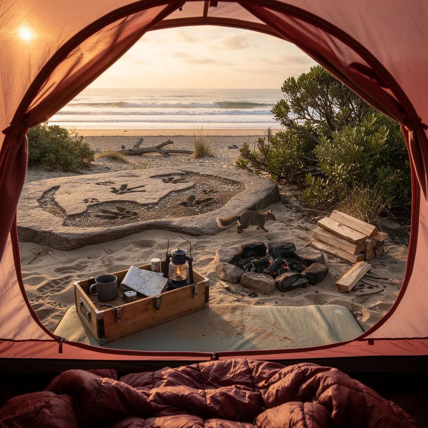 A dusty-rose tent sits on a sandy beach, glowing in the warm late-afternoon sun as waves whisper nearby. From inside a cozy sleeping bag, you can see a wooden gear box, a tidy stack of firewood, and a small stone fire ring. Rocks by the water hold faint dinosaur footprints, and a little squirrel darts across the sand by the dune bushes.