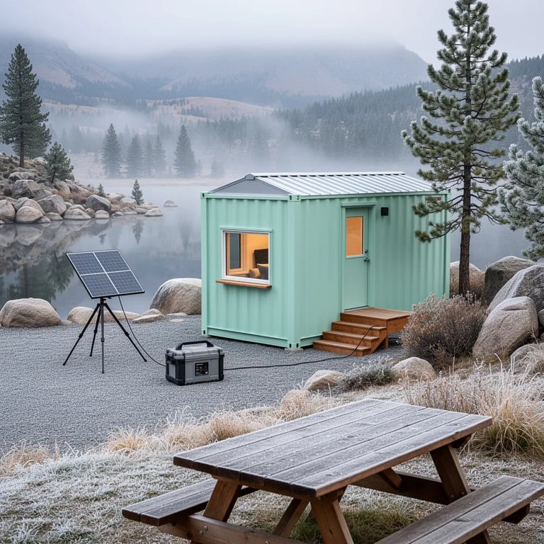 A mint‑green cabin sits by a quiet mountain lake, its reflection shining on the still water. Frost sparkles on the rocks and grass, and a thin mist curls over the shore. A wooden picnic table holds a metal mug, a trail map, and an open nature book, waiting for the hiker to return.