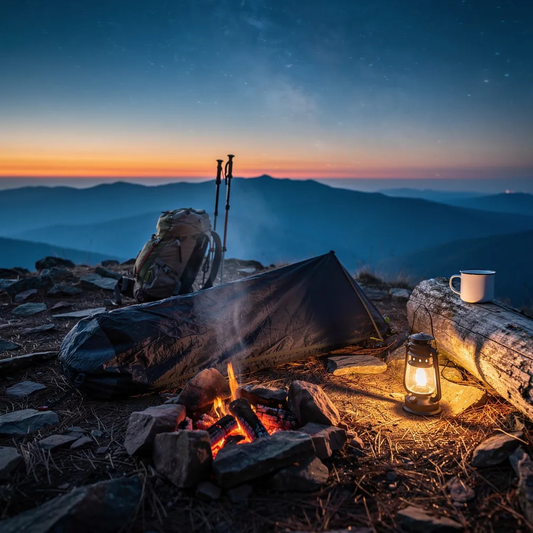 A tiny bivy shelter sits on a rocky ridge, surrounded by pine needles and cool mountain air. A warm lantern and a small ember fire glow beside a backpack and a mug on a weathered log. Far away, the Blue Ridge mountains fade into the dark as the first stars begin to sparkle.