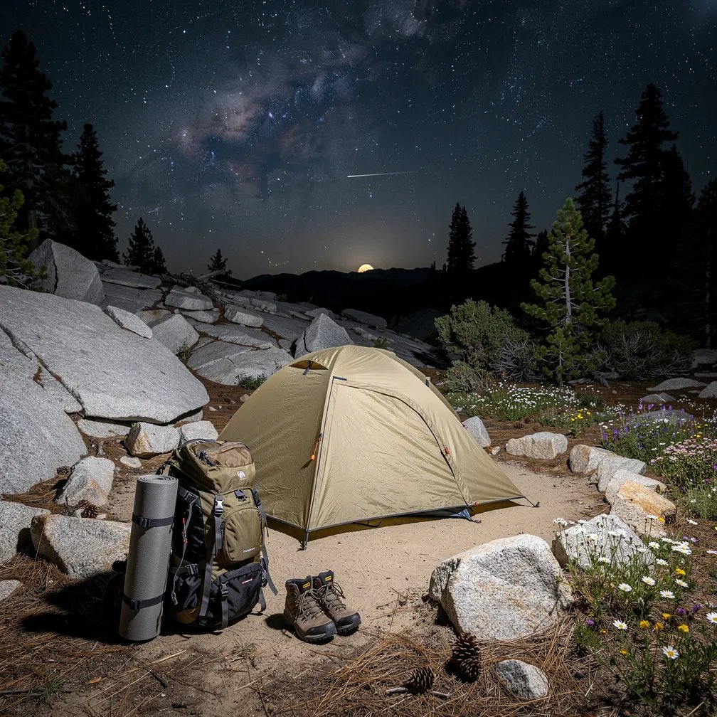 A khaki tent sits on a soft patch of pine needles, tucked between big gray granite rocks. A backpack and boots rest neatly beside it, with tiny wildflowers dotted around the ground. Above, the night sky is calm and clear, with the Milky Way faintly glowing and a small meteor streaking past near the low moon.