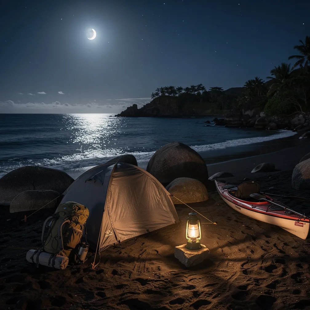 A quiet campsite sits on dark volcanic sand by the sea, with big boulders all around. A charcoal-gray tent and a backpack rest near the shore, and a kayak is pulled up on the wet sand. A vintage lantern glows warm and bright, while a crescent moon hangs in the clear night sky.