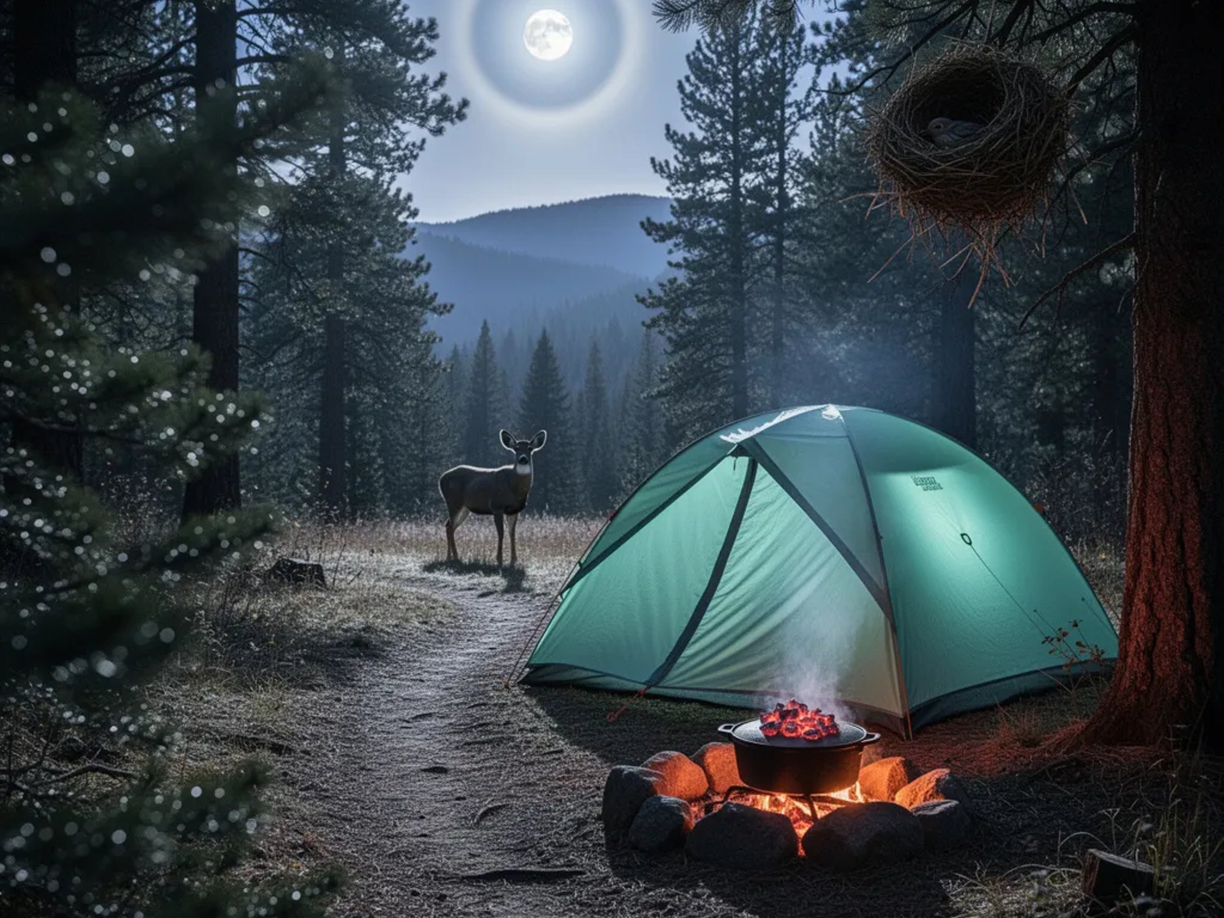 A mint green tent sits in a small forest clearing, tucked under tall pine and fir trees. The full moon shines through the branches, while a low fire ring glows softly beside a heavy dutch oven. A mule deer watches from the dark treeline, and a little bird’s nest rests high above. The whole camp feels quiet, cold, and wild.