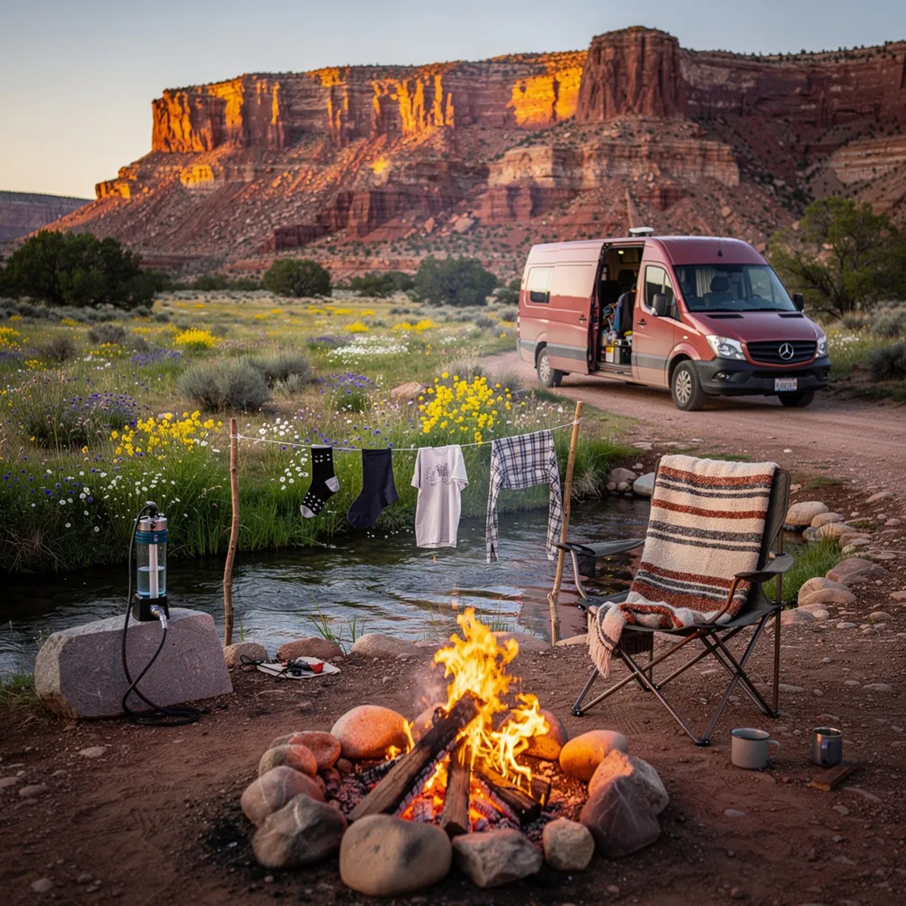 A small stream runs by a quiet meadow full of summer wildflowers, with tall red cliffs far away. A dusty pink van sits near a warm campfire, and the flames glow as the sun goes down. A chair with a cozy blanket, a simple clothesline, and a water bottle on a rock make the camp feel ready for the night.