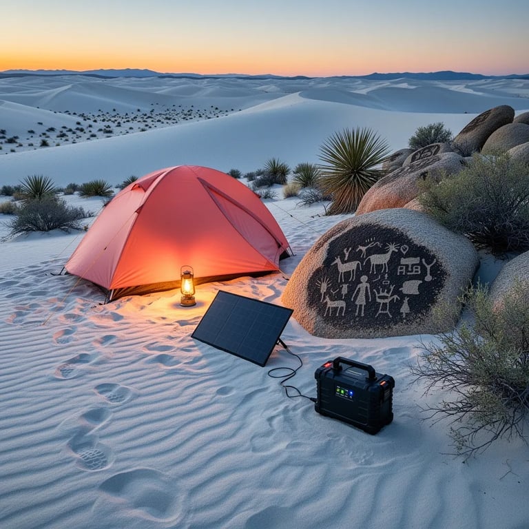 A coral-colored tent sits on rippled white sand as the sun sets in soft gold light. A warm lantern glows by a small solar panel and battery pack. Around the campsite, yucca and scrub cling to the dunes, and nearby dark rocks show old petroglyph carvings. The air feels quiet and wide, like the desert is holding its breath.