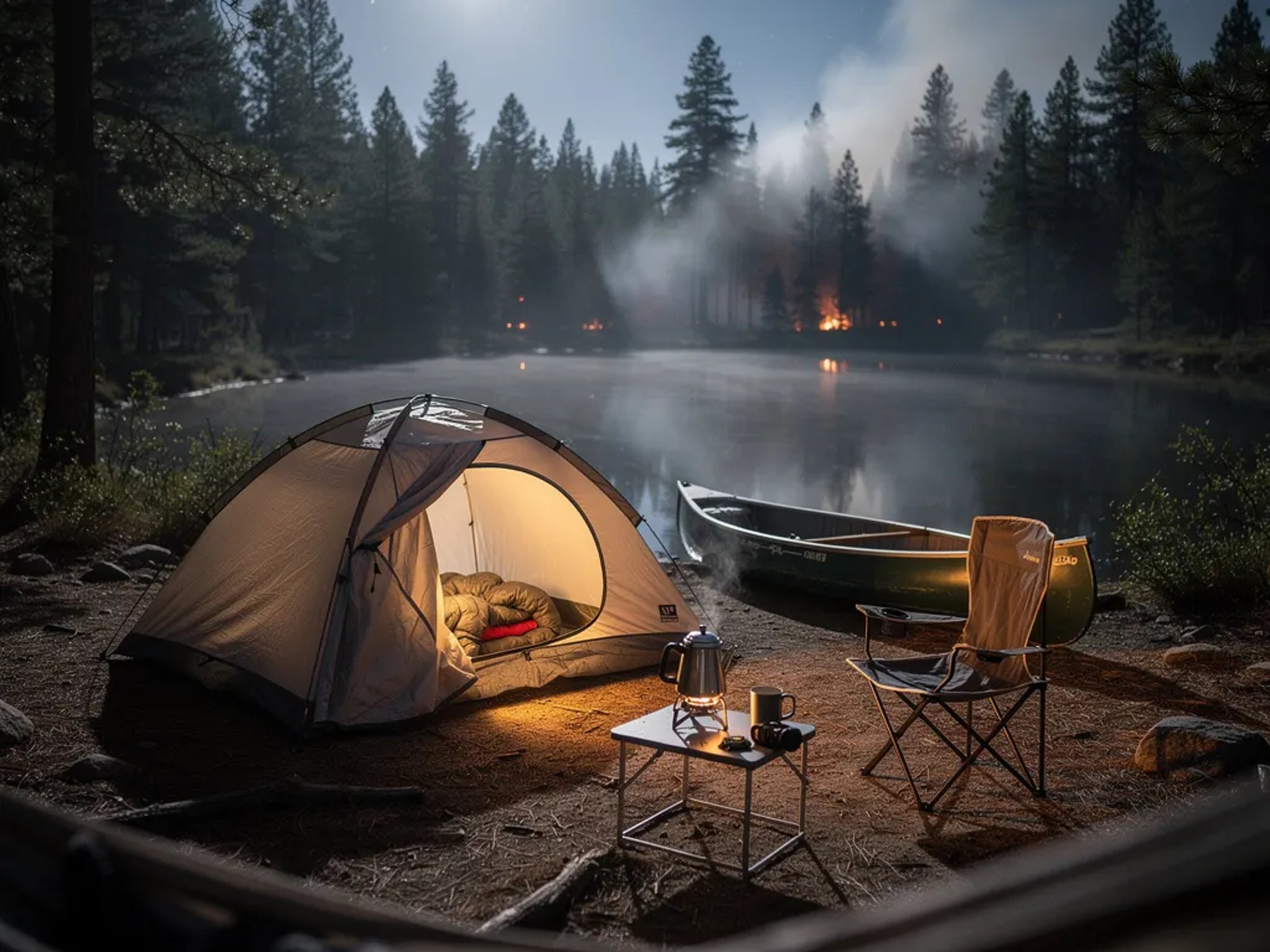 A quiet forest campsite sits by a still lake under a bright full moon. A slate-gray tent glows warm from inside, with a canoe resting on the shore nearby. Soft smoke drifts through the trees, making the moonlight look hazy and dreamy. A small chair and a tiny stove with a coffee pot make the camp feel cozy and calm.