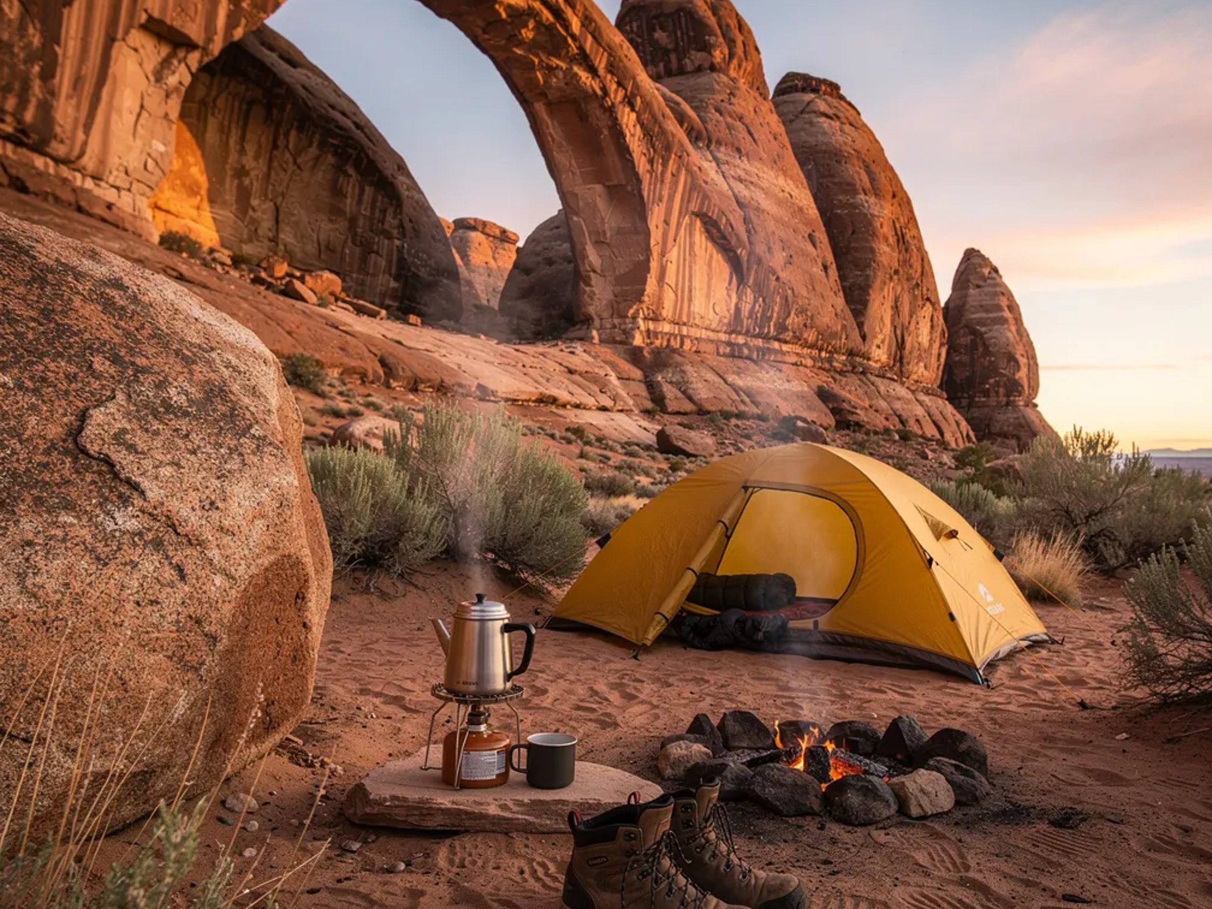 A mustard-yellow tent sits on soft sandy ground under huge red rock arches. The sunrise makes the desert glow, and sagebrush and tough little shrubs dot the campsite. A fire ring waits nearby with hiking boots beside it, and a small stove puffs steam from a coffee pot in the cool morning air.