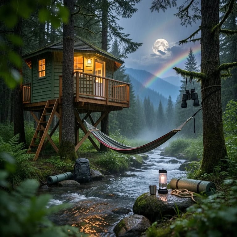 A cozy treehouse glows warmly above a quiet forest creek at dusk. Soft rain falls on the shiny, wet leaves while mist rises from the water. A rainbow curves over distant hills as the moon peeks through the clouds. A hammock and neat camping gear wait peacefully under the tall, dark evergreens.