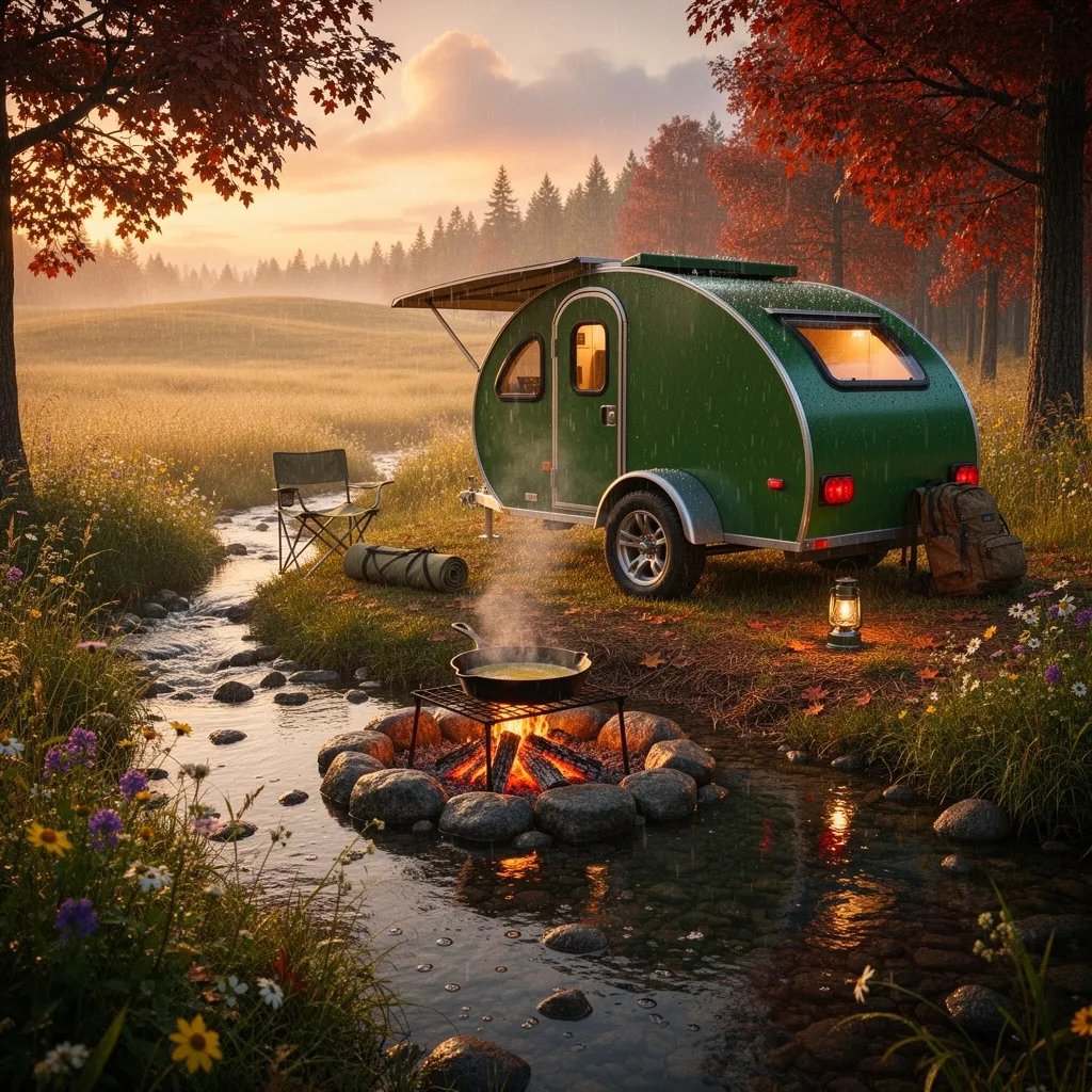 You peek out from your cozy tent to see a tiny green trailer by a clear, winding stream. Soft golden light glows on red and amber trees while a gentle drizzle makes the air misty. A small campfire crackles with a skillet over the glowing coals. Wet grass, wildflowers, and scattered gear make it feel like a secret forest hideout.