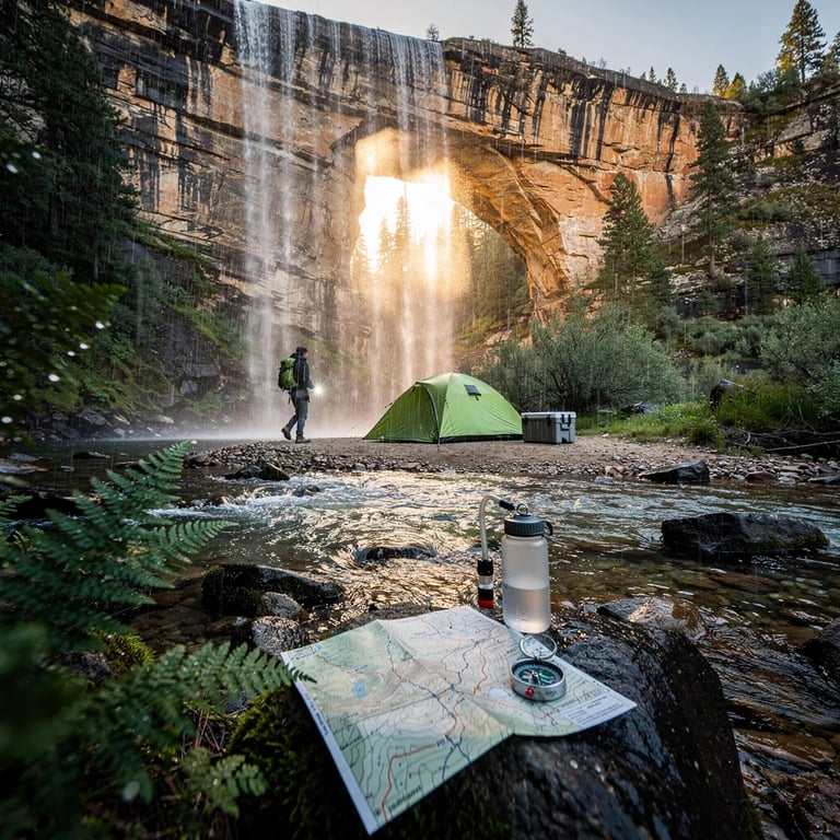 A misty waterfall splashes over wet rocks and bright ferns, opening onto a quiet camp by a shallow stream. A lime-green tent sits in the warm sunset light beneath a huge sandstone arch. A map and compass rest on a rock, and a cooler and water gear wait by the water. In the distance, a lone hiker walks in with a small flashlight glowing.