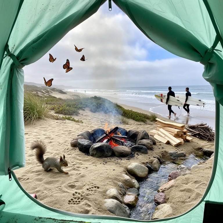 From inside a mint-green tent, you can see a sandy bluff and the ocean beyond the dunes. A campfire ring glows with warm embers, and the wet sand shines after the rain. Two surfers walk by the shore with their boards while a gray squirrel darts past. A small trickle of fresh water runs over rocks as monarch butterflies drift on the cool sea breeze.
