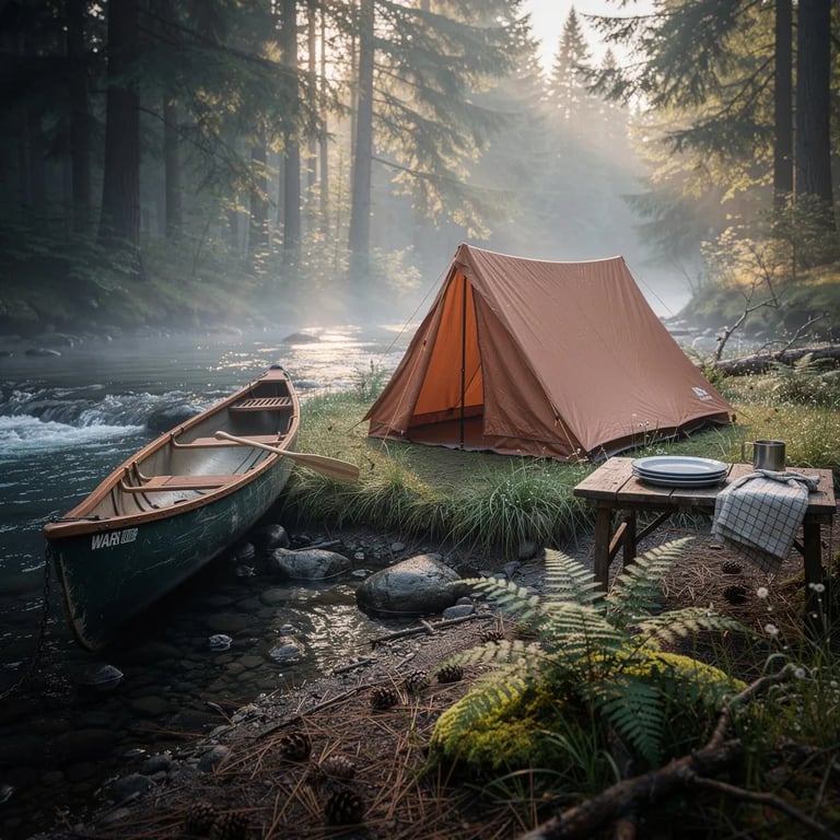 A quiet river curls through a misty evergreen forest as the first light of dawn glows between the tall trees. A copper canvas tent sits near the water, with a weathered canoe resting on the grassy bank. Wet rocks shine softly, and pine needles and ferns cover the ground like a forest carpet.