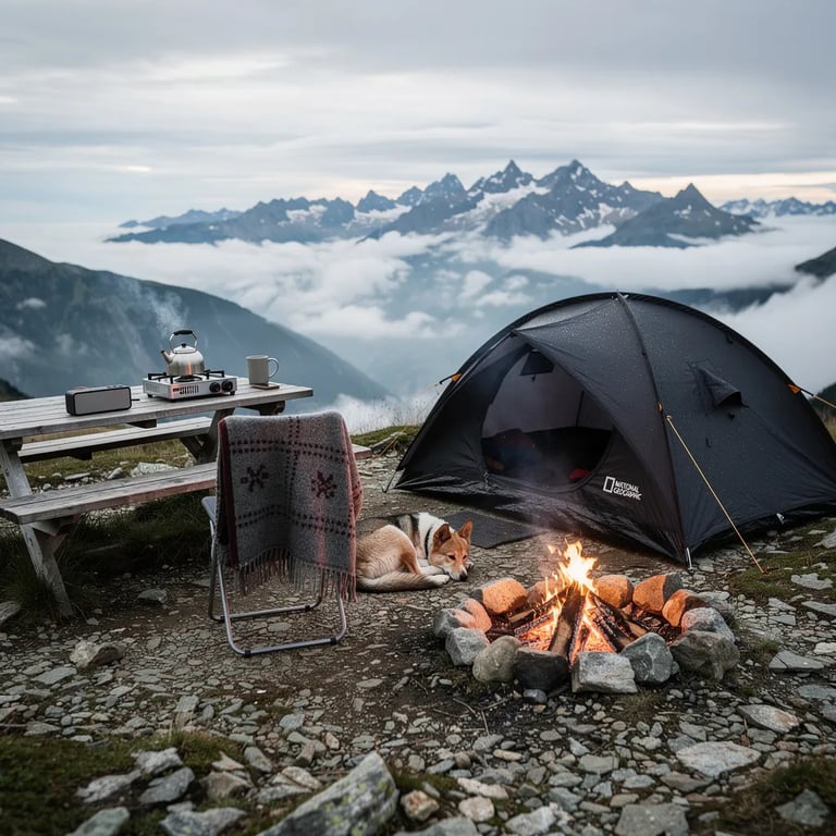 A small black tent sits on a rocky ridge high in the Swiss Alps, with clouds rolling like a soft ocean below. Misty, jagged peaks rise in the distance under a calm gray sky. A picnic table holds a little stove and kettle, while a tiny fire glows and a dog sleeps nearby. The whole campsite feels quiet, cozy, and wild.