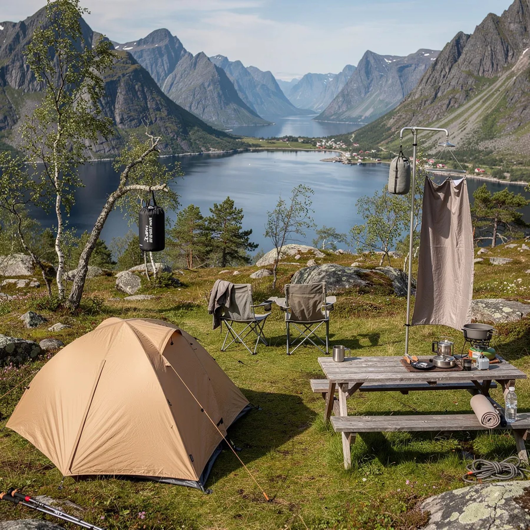 A tan tent sits on a rocky grassy hill above a bright blue fjord, with crisp air and clear midday sun. Two chairs face the water, and a weathered table holds a small stove and pots. A food canister hangs from a tree branch, and a simple outdoor shower screen stands nearby. The wide view feels quiet, wild, and fresh.