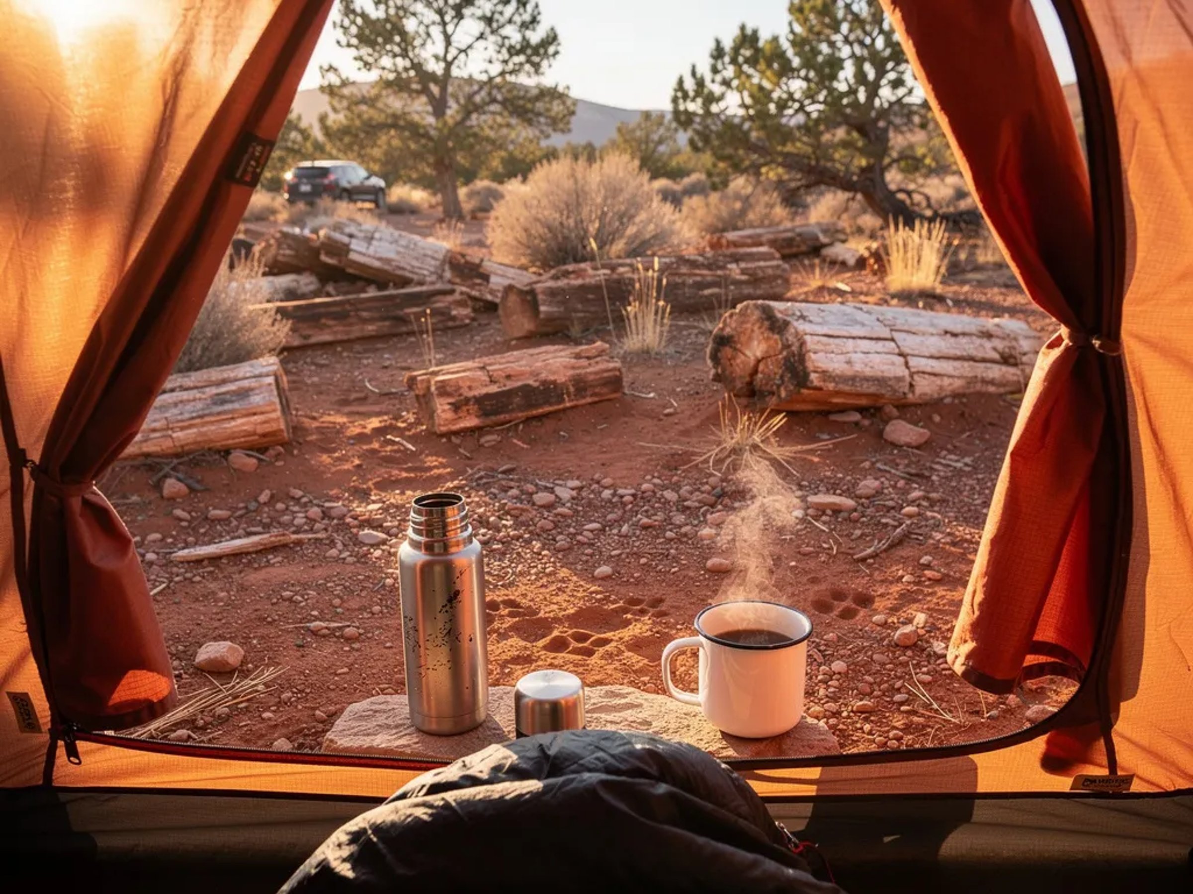 Warm afternoon sunlight pours into a dry, red desert forest dotted with old petrified logs. A copper tent sits with its door open, and you can see a thermos and a mug of steaming coffee by the entrance. Faint animal tracks cross the dusty ground, making the place feel quiet, wild, and full of secrets.