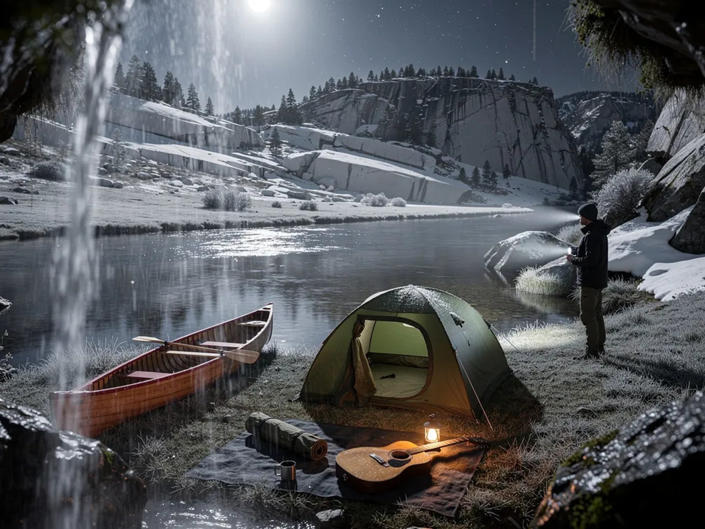 A cold mountain meadow sits by a quiet river pool, with a misty waterfall framing the view. An army-green tent glows softly under the moon and stars, while a canoe rests on the bank and a guitar lies nearby. In the distance, a lone hiker shines a flashlight through the spray, and dark pine trees stand against the granite hills.