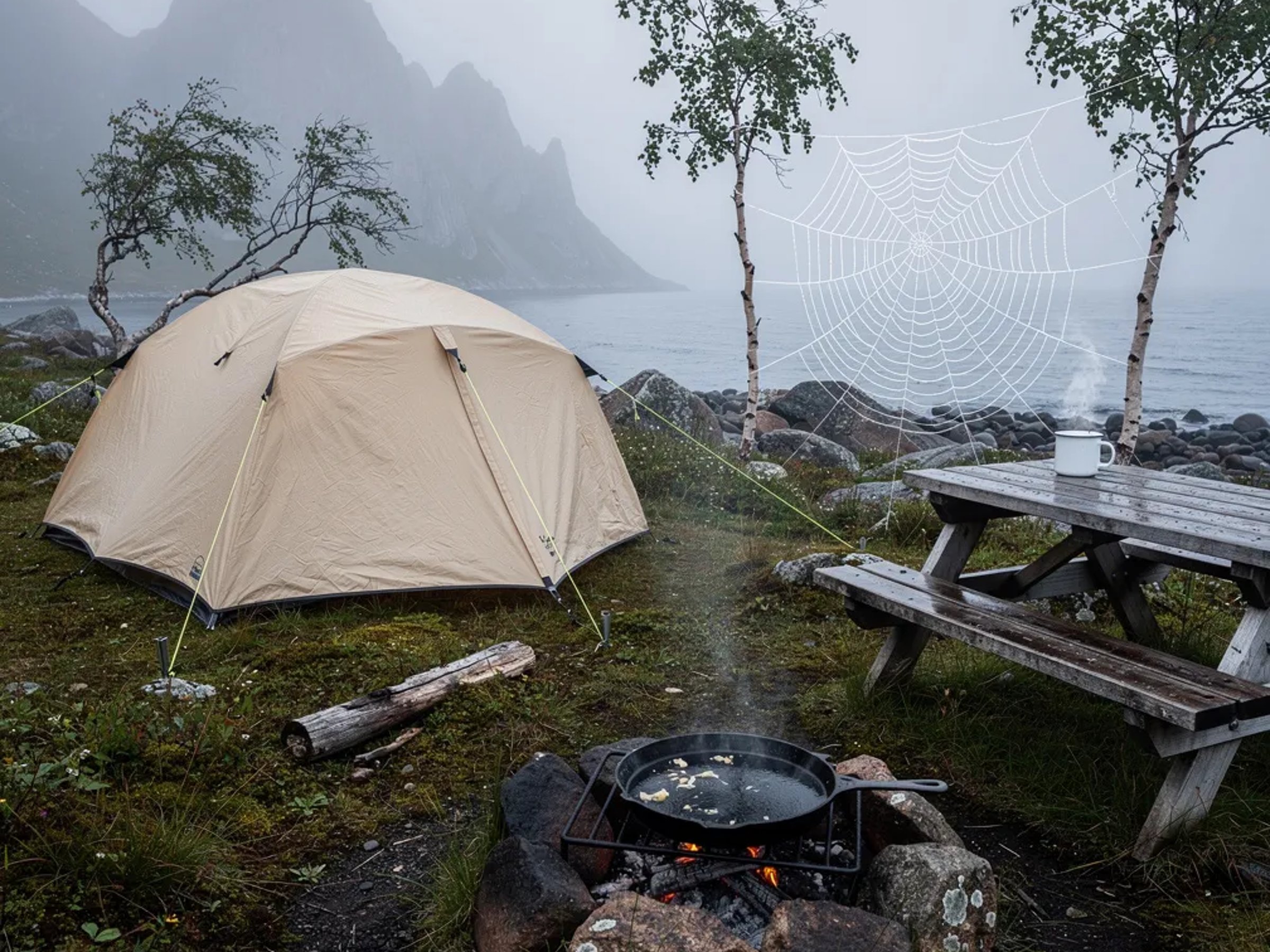 A quiet tent sits on soft, mossy ground by dark granite rocks and small birch trees. Sea fog drifts in after the storm, making everything feel calm and hushed. Dew sparkles on a tiny spider web, and a skillet warms over a small fire with thin smoke curling into the gray dawn.