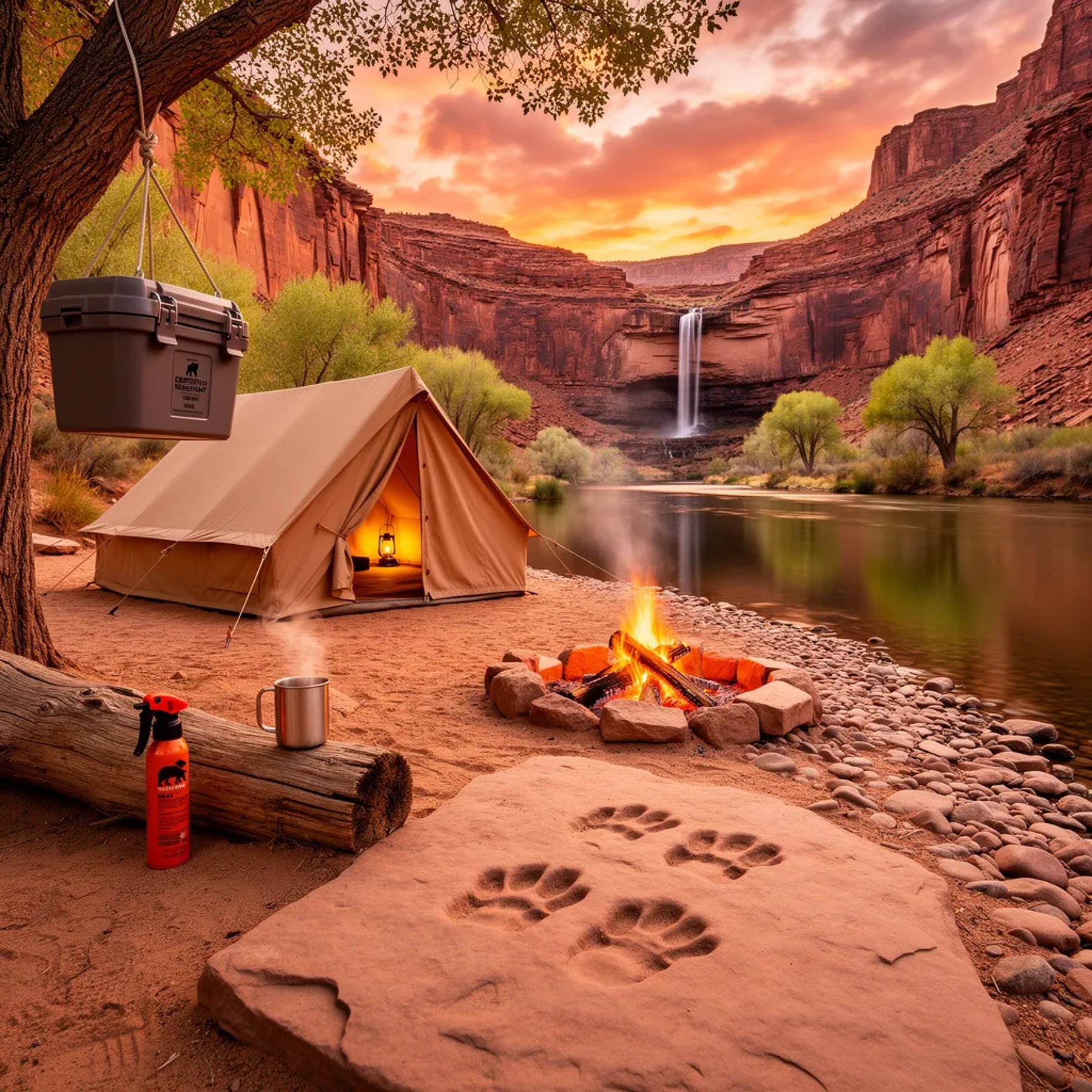A cozy tan tent glows softly beside a calm desert river at sunset. Red rock cliffs shine orange in the fading light, and a tiny waterfall trickles into the water. A small campfire flickers near a metal mug on a log, while a food container hangs safely from a tree. Fossil footprints in the sandstone hint at ancient creatures that once walked here.