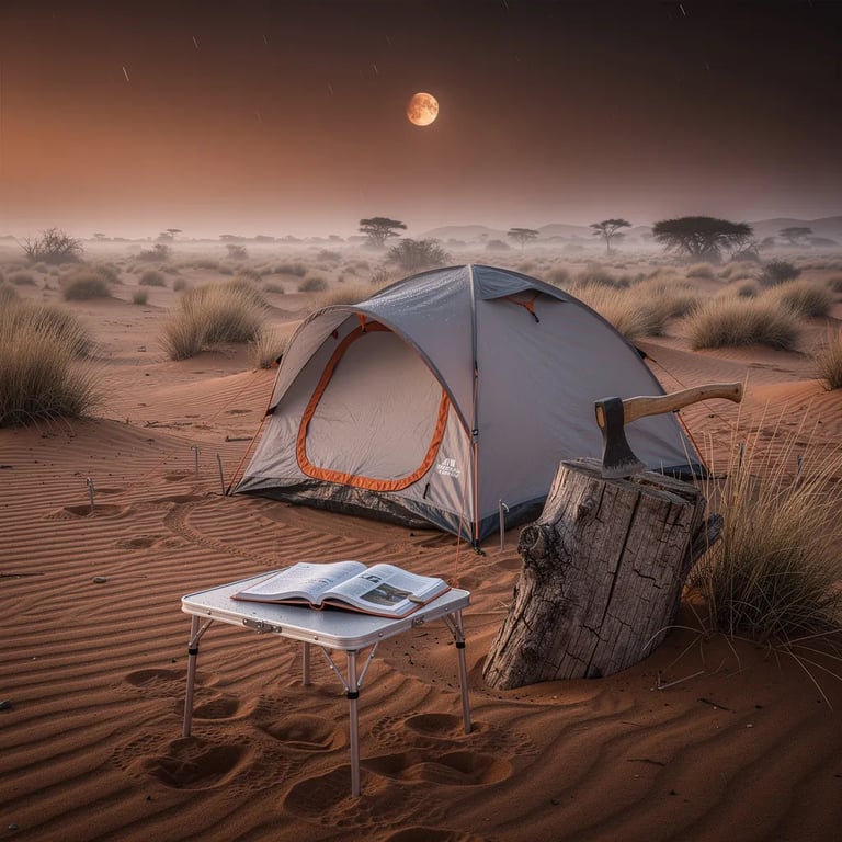 A grey-and-orange tent sits on firm sand in the Namib Desert, surrounded by dry dune grass and quiet fog. Above, a copper-colored moon hangs in the sky and makes the whole camp feel calm and strange. An old tree stump holds an axe, and a small table has an open book that looks damp with mist.