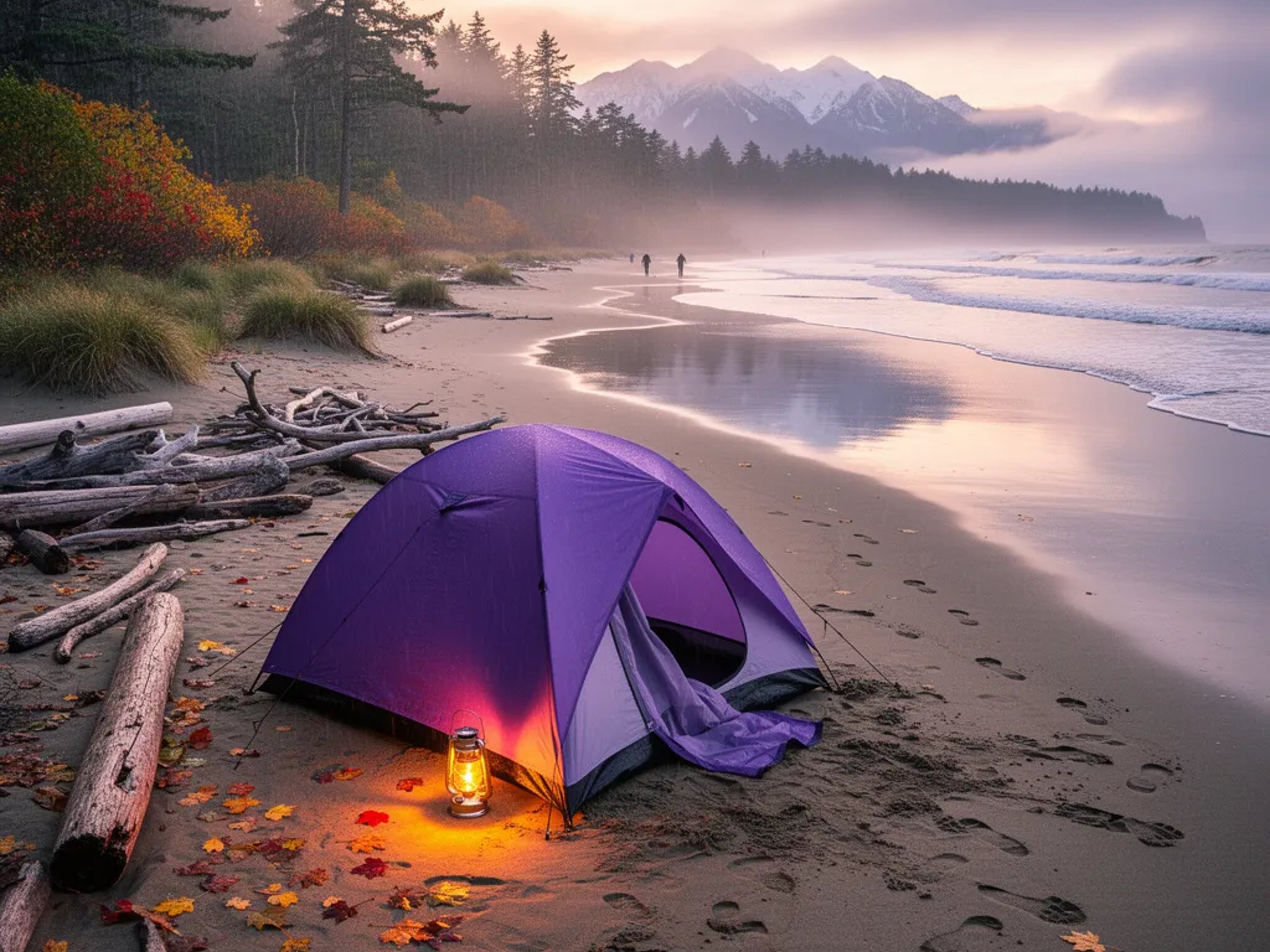 A bright purple tent sits on the wet sand of Cannon Beach as gentle waves roll in nearby. A warm lantern glows by the tent door, reflecting softly in the shiny sand. Misty air, drifting leaves, and tall trees with autumn colors make the campsite feel quiet and magical. Snowy mountains rise in the distance under a golden-pink evening sky.
