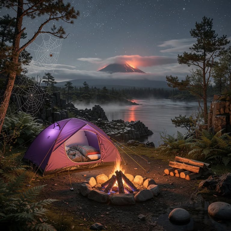 A purple tent sits on a ferny riverbank as the slow river glides by in the dark. A small campfire glows warm, lighting up stacked logs and a tiny spider web between two trees. Above, the sky is packed with stars, and a faraway volcano paints the clouds with a soft orange shine.