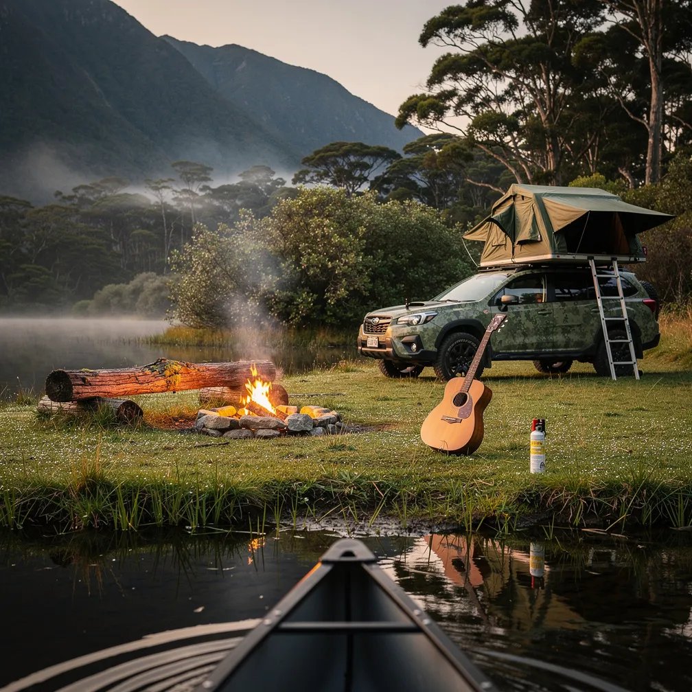 A calm lake glows at dusk as a canoe drifts toward a misty shore. Dewy grass and tall beech trees wrap the campsite in quiet, golden light. A camo Subaru sits by the treeline with a rooftop tent open, while a small fire ring, a big log, and a wooden guitar wait nearby.