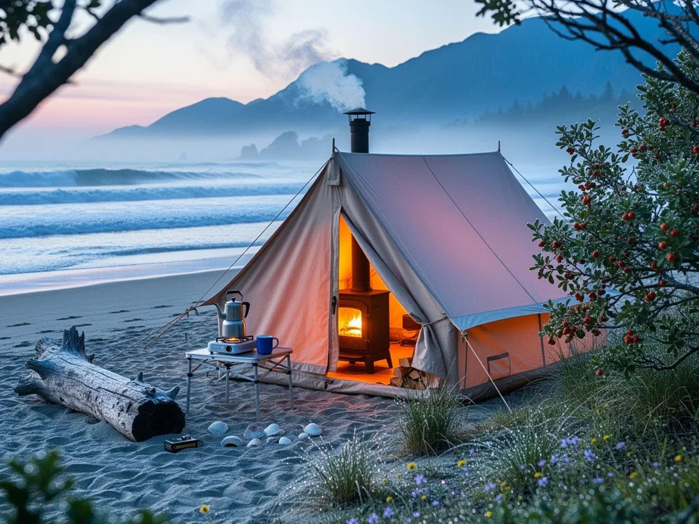 A warm, glowing tent sits on a quiet beach as the soft waves roll in. Cool blue dawn light colors the sky, with pink on the horizon and mist over distant mountains. Dew sparkles on dune grass, wildflowers, and leaves around the tent. A tiny stove and coffee pot wait on a small table, making the campsite feel cozy and calm.