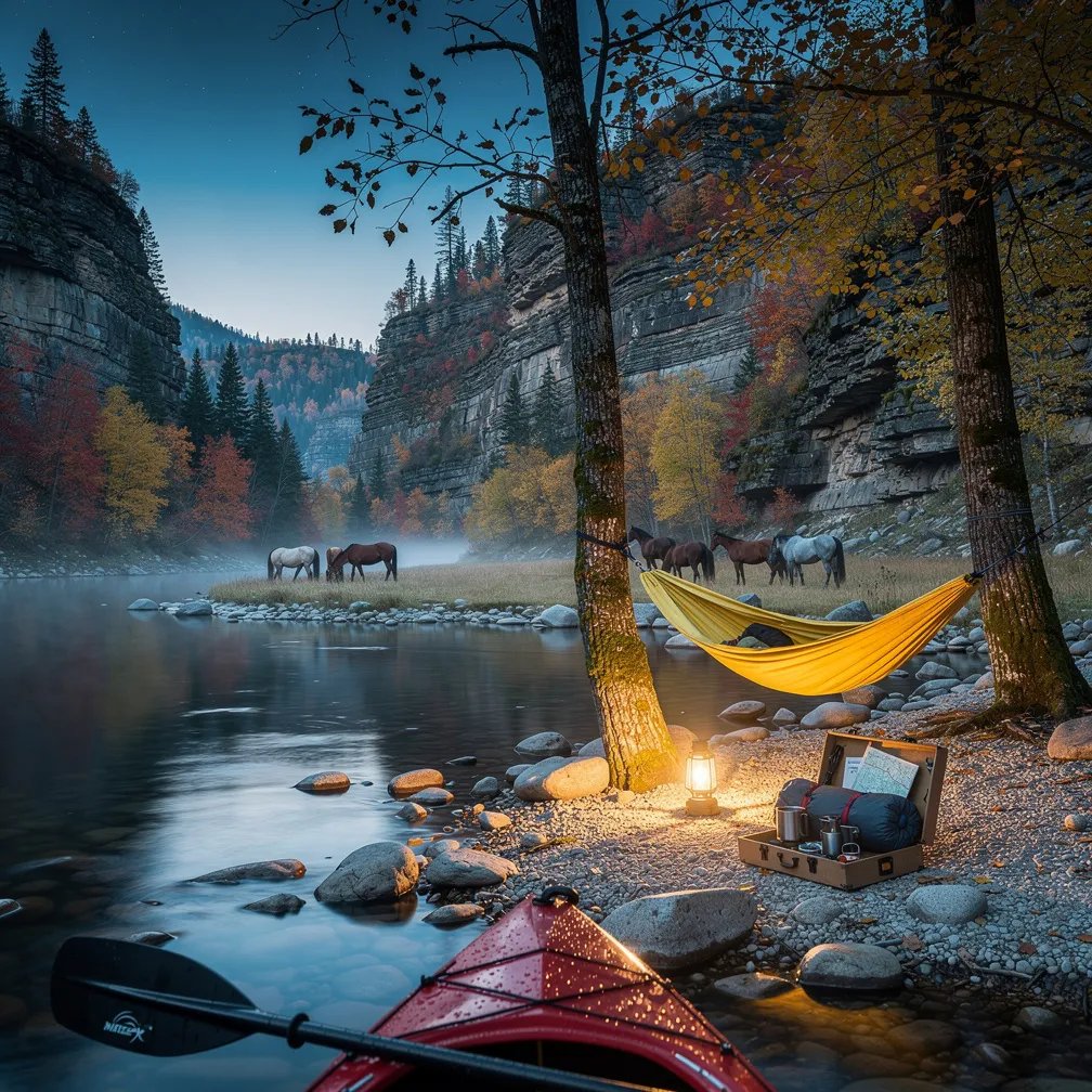 A rocky river gorge glows in cool blue dusk, and the calm water mirrors the tall cliff walls. A bright yellow hammock hangs between two trees by the shore, with a small lantern shining beside neat camping gear on the gravel. Autumn trees frame the scene, and tiny stars peek out above. Far past the gorge, a quiet meadow holds a small herd of wild horses grazing.