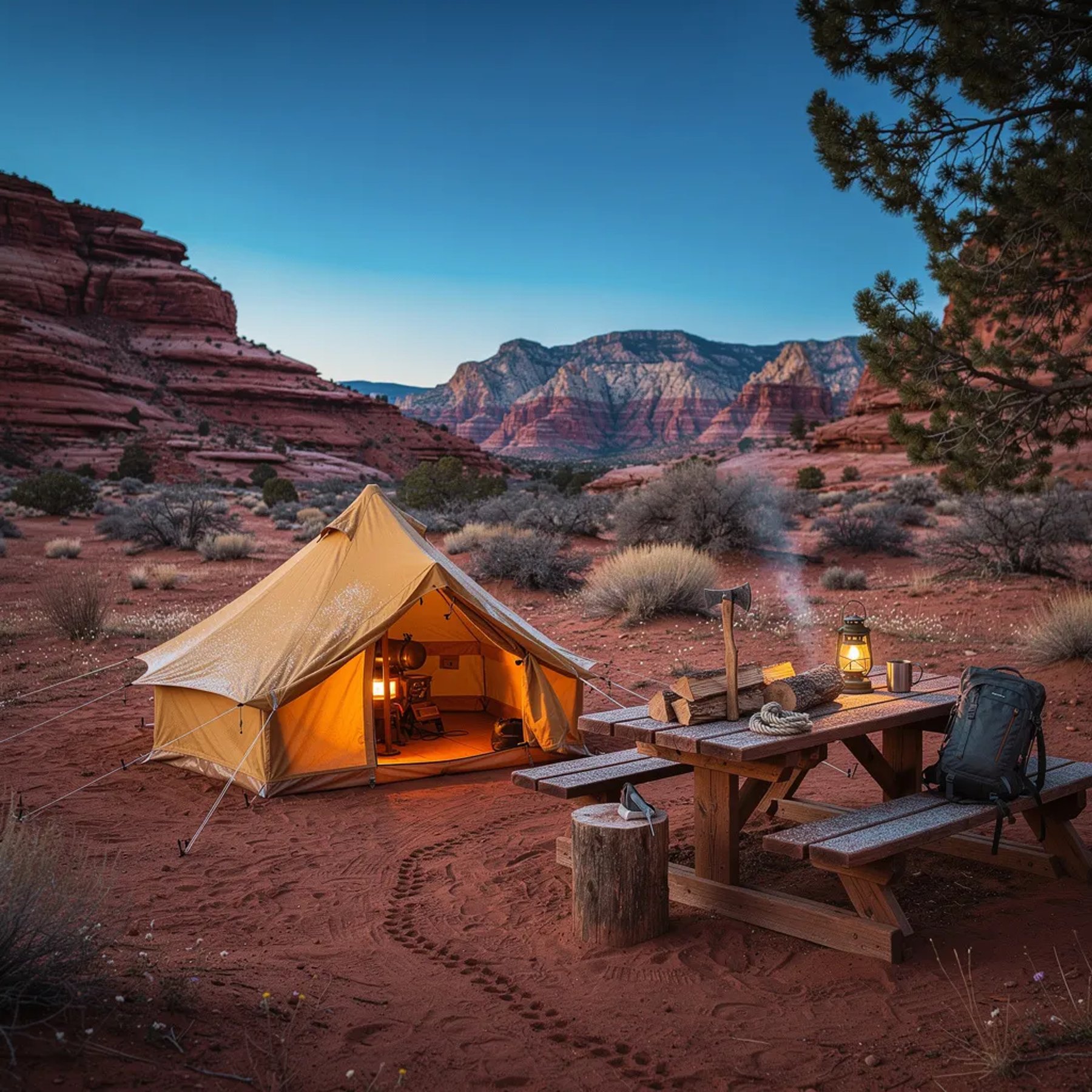 In the cool blue dawn, a mustard-yellow tent sits on sandy red ground among tall sandstone rocks and desert shrubs. A picnic table and a neat stack of firewood wait nearby, while a tiny stove glows softly inside the tent. Faint animal tracks curl through the dirt as the canyon wakes up quietly.