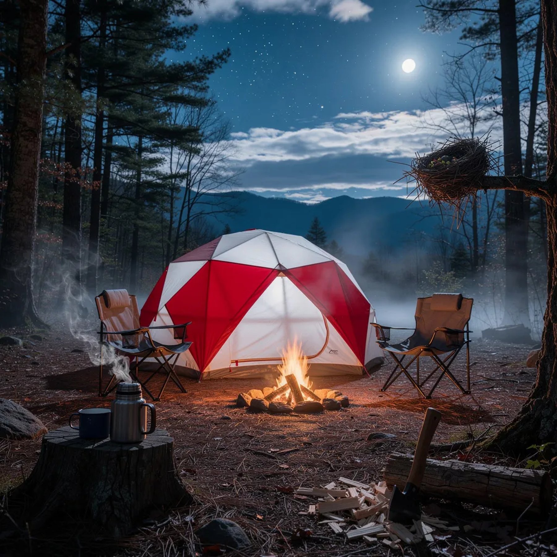 A cool blue night wraps around a misty forest clearing in the Smoky Mountains, with stars peeking through thin clouds. A red-and-white dome tent glows softly by a small campfire, with two chairs waiting nearby. Steam curls from a coffee thermos on a stump, and an axe rests in a chopping block while a tiny bird’s nest sits tucked in a tree branch.