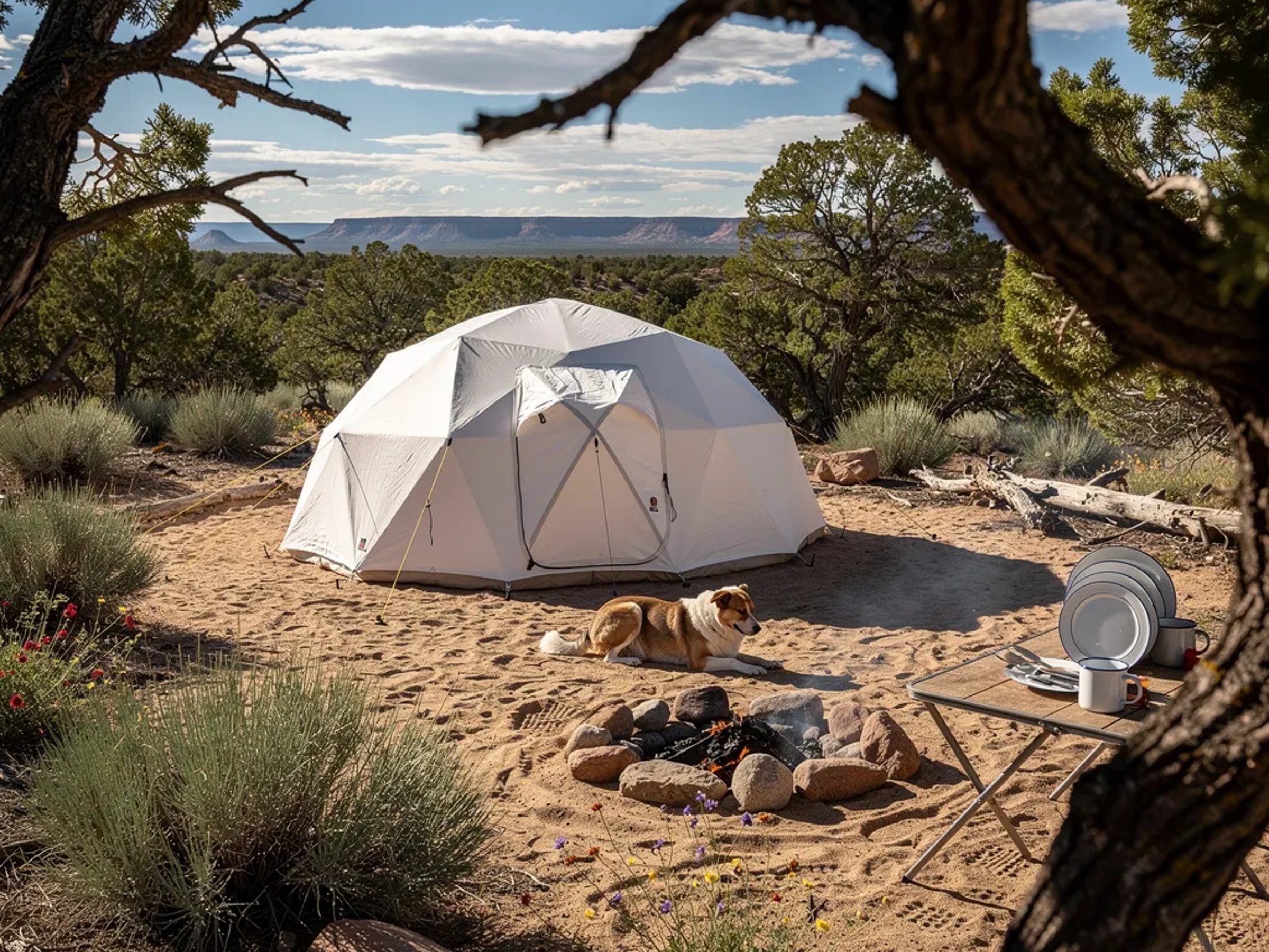 A white dome tent sits on sandy ground beside piñon and juniper trees in the hot New Mexico desert. The midday sun makes sharp shadows, and a light dusty haze hangs in the air. A small stone fire ring glows faintly while a sleepy dog rests nearby, with camp plates stacked neatly on a low table.