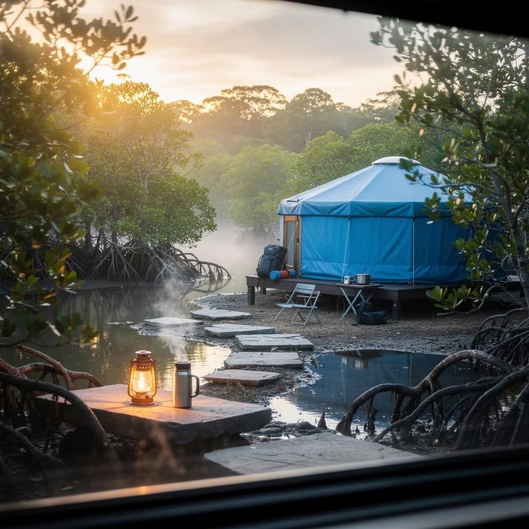 A quiet mangrove swamp campsite glows in the golden sunrise, with mist drifting over calm water and twisted roots. A steel-blue yurt sits on a small platform, tucked into a green clearing. A warm lantern shines beside a thermos of coffee, making the scene feel cozy and peaceful.