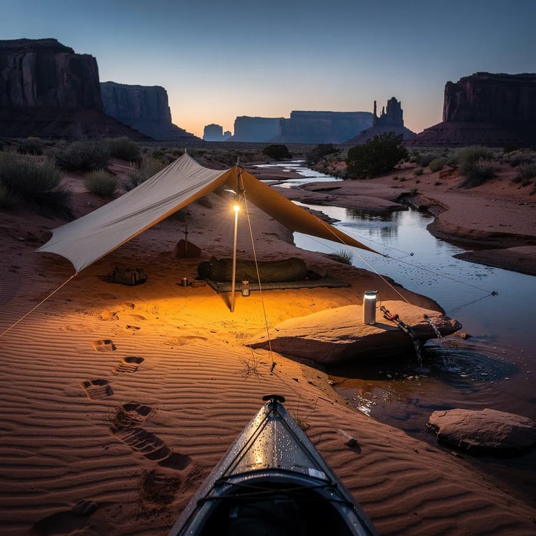 A cool blue twilight wraps around a sandy desert wash, with tall red rock buttes dark on the horizon. A low tan tarp shelter hugs the ground, and a hanging headlamp glows warm like a tiny campfire. Fresh animal tracks ripple through the sand toward camp, and a small trickle of water shines beside a filter and bottle. The bow of a kayak rests at the edge, ready for the next quiet stretch of wild.