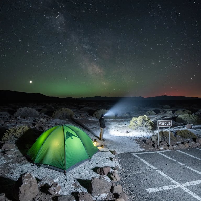 A bright green tent glows on the rocky desert ground, surrounded by a few tough little shrubs. Above it, the night sky is wide and clear, with the Milky Way shining like a river of stars. A lone camper sweeps a flashlight across the sand, and the moon hangs low on the far horizon.
