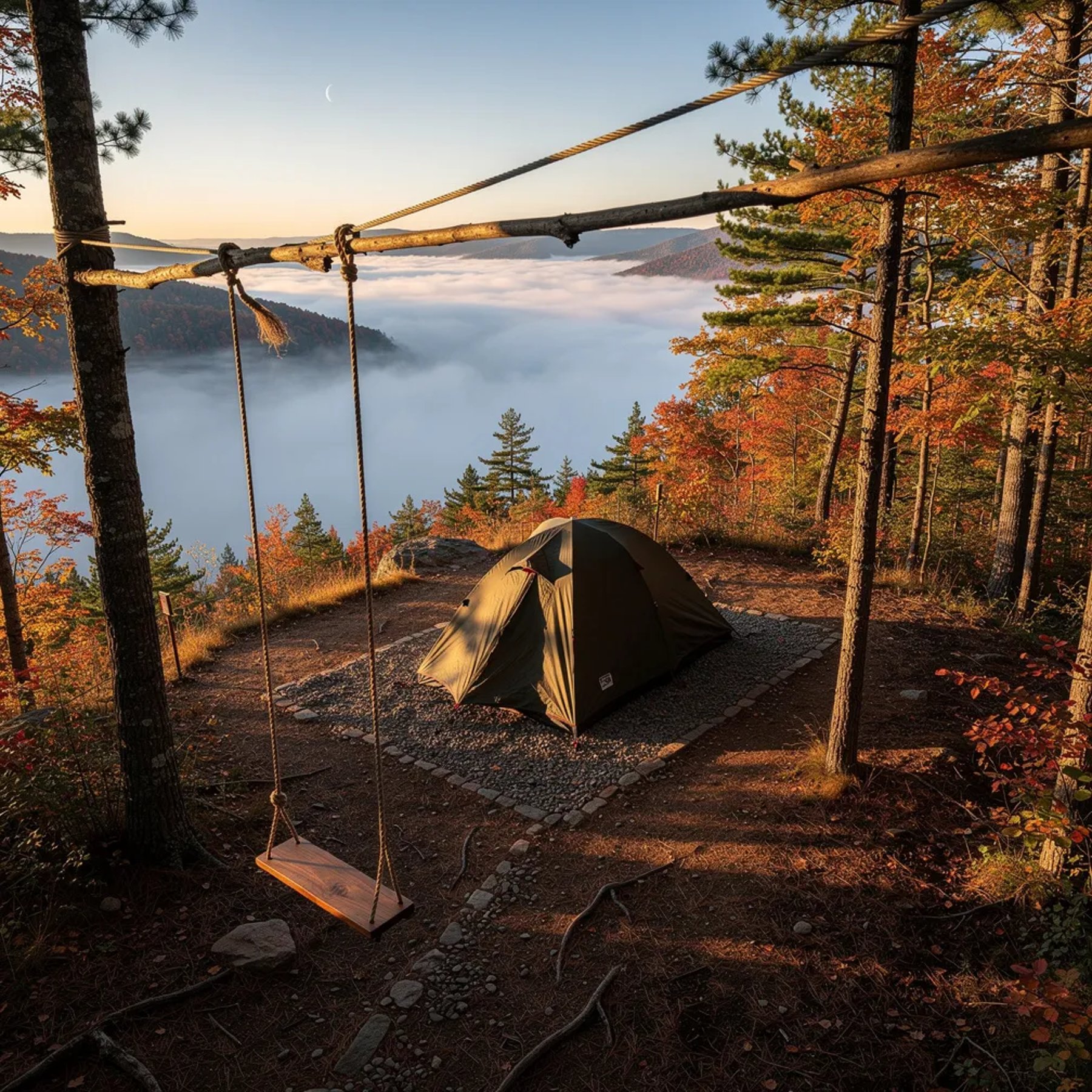A small green tent sits on a pine-needle clearing high above a misty valley. Warm sunset light glows through tall trees with green needles and bright fall leaves. A rope swing hangs from a thick old branch, and the whole place feels quiet and magical.