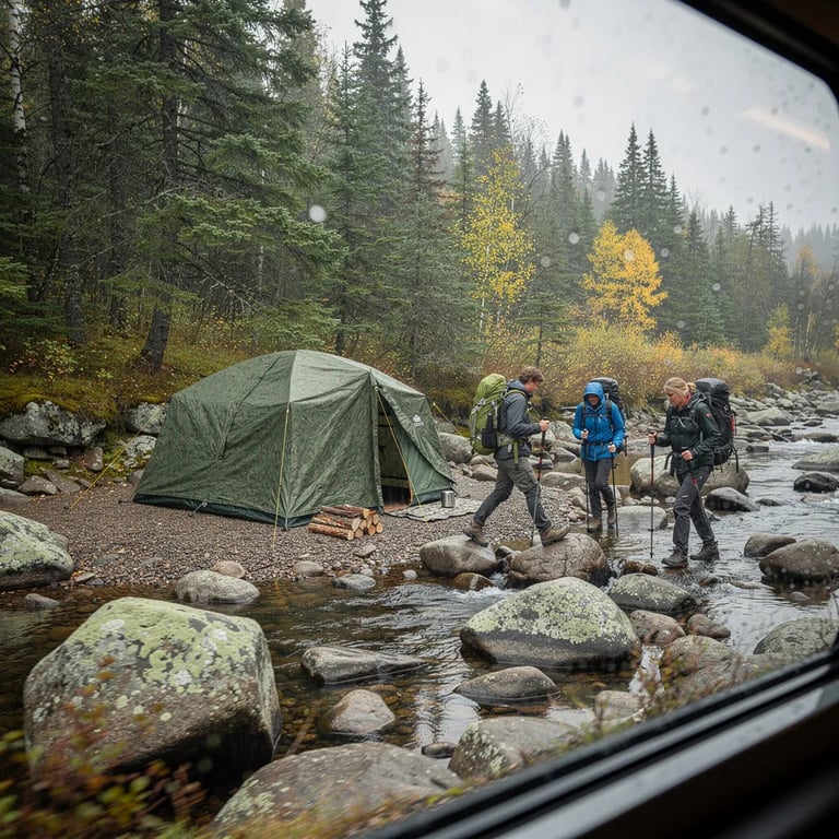 A green camo tent sits on rocky ground beside a shallow stream, surrounded by tall pine and spruce trees. The sky is gray and the light feels soft and quiet, with wet stones shining near the water. A few hikers hop across the rocks, and the scene looks like a quick glimpse from a train window.