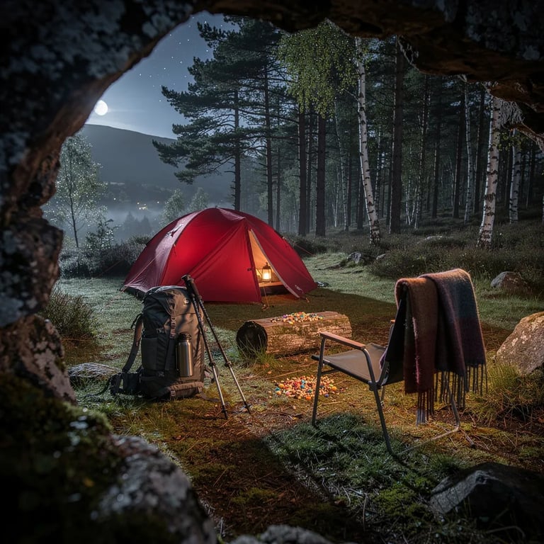A rust-red tent glows softly in a quiet forest clearing in the Scottish Highlands. Cool moonlight shines on wet grass and moss, and a rough stone arch frames the scene. A backpack, a camp chair with a wool blanket, and a log with a little trail mix make it feel warm and ready for rest.