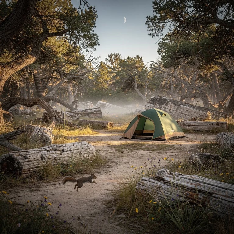 A green-and-tan tent sits in a quiet clearing of sandy ground and stone logs. Warm sunset light shines through the trees, and a thin mist floats near the grass and tiny wildflowers. A squirrel darts by as the woods grow calm, and a faint crescent moon peeks overhead.